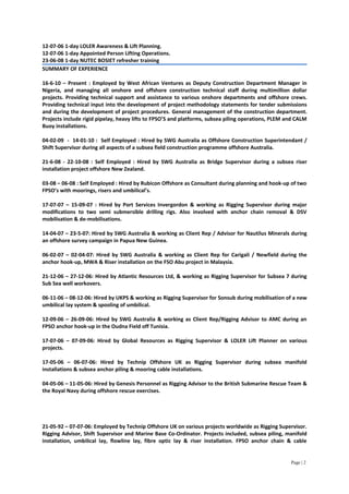 4) Employment history describing his roles and responsibilities in offshore construction and project management positions over the past 10 years.