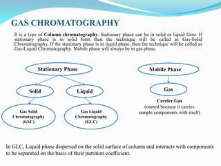 Gas chromatography is a type of chromatography that uses a mobile gas phase to transport sample components through a column containing a stationary liquid or solid phase. The separation of components is based on their distribution between the mobile gas phase and stationary phase. There are two main types - gas-solid chromatography where the stationary phase is a solid, and gas-liquid chromatography where the stationary phase is a liquid coated on an inert solid support. Common applications of gas chromatography include separation and analysis of organic and inorganic compounds, study of reaction rates and mechanisms, and determination of molecular properties.