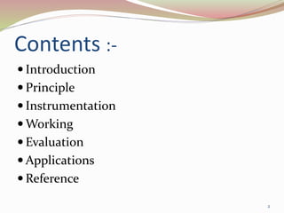 Gas chromatography is a technique used to separate components of a mixture based on how they partition between a mobile gas phase and a stationary liquid phase. It involves vaporizing the sample and injecting it into a column containing a stationary phase, where components are separated as they are transported through the column by the mobile gas phase at different rates depending on their partition coefficients. Common detectors used at the end of the column include the thermal conductivity detector, electron capture detector, and flame ionization detector, which produce signals proportional to the concentration of eluting components. Gas chromatography has many applications in fields like pharmaceutical analysis, food testing, and environmental analysis.