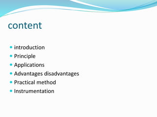 Gas chromatography is a technique used to separate and analyze compounds that can be vaporized. It works by partitioning samples between a gas mobile phase and liquid stationary phase in a column. The separation depends on how the compounds partition between the phases. Key components of a GC system include the carrier gas, sample introduction system, column for separation, and detection system such as FID or TCD. Common applications include analysis of aromatics, hydrocarbons, flavors, and other volatile organic compounds.