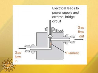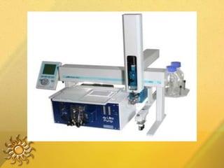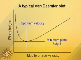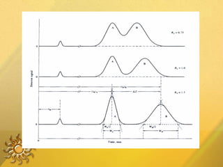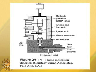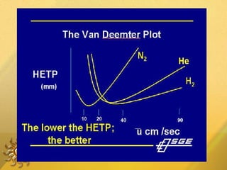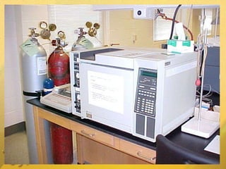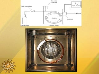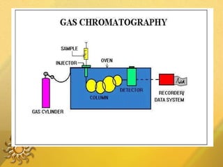 Gas chromatography is a technique used to separate and analyze volatile compounds. It works by injecting a sample into a column through which an inert gas flows, carrying the separated components out at different rates depending on their interactions with the stationary phase coating the column. The separated components are detected to produce a chromatogram showing peaks that can be analyzed to determine the identity and quantity of each component in the original sample.