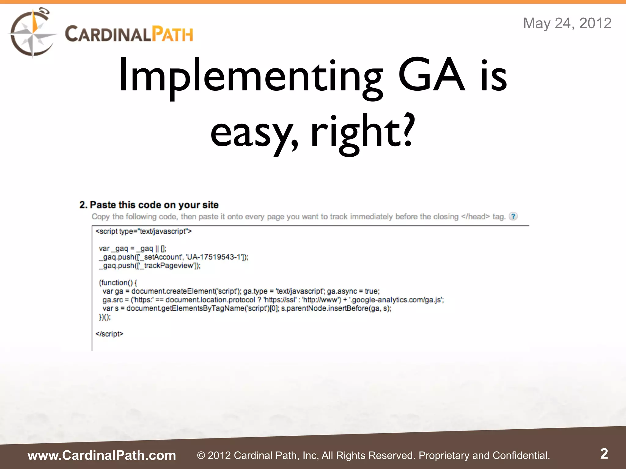 The document discusses the implementation of Google Analytics (GA) and introduces a library called GAS for enhanced event tracking. It highlights the ease of setup, the multidimensional nature of events, and details the additional tracking capabilities provided by GAS, such as tracking outbound links and video interactions. The document also covers script examples for tracking multiple domains and various user interactions.