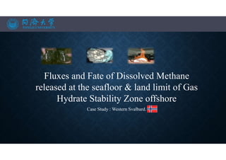 The document discusses the fate of methane released at the seafloor and the stability of gas hydrates offshore Western Svalbard. It highlights that high concentrations of dissolved methane are primarily lost through oxidation and advection by strong bottom water currents, while vertical mixing may contribute to methane escape into the atmosphere. The findings suggest that aerobic methanotrophy serves as a barrier to substantial methane release from gas hydrates to the atmosphere.