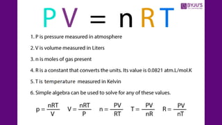 The document discusses gas laws, which describe the relationships between pressure, volume, temperature, and the amount of gas. It highlights three primary laws: Boyle’s Law, Charles’ Law, and Avogadro’s Law, along with the Ideal Gas Law that combines these principles. Additionally, it differentiates between ideal gases, which behave theoretically without interactions, and real gases, which exhibit volume and elastic collision characteristics due to intermolecular forces.