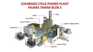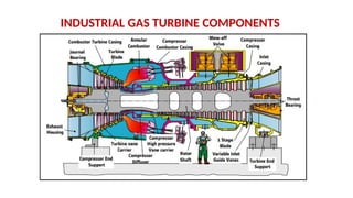 The document describes the components and operational philosophy of the MS9001E gas turbine used in a combined cycle power plant. It details the turbine's key parts such as the axial compressor, combustor, and turbine rotor, along with their functions in the Brayton cycle. Additionally, it outlines the ancillary systems supporting gas turbine operations, including air intake, lubrication, cooling, and the starting methods utilizing a static frequency converter.