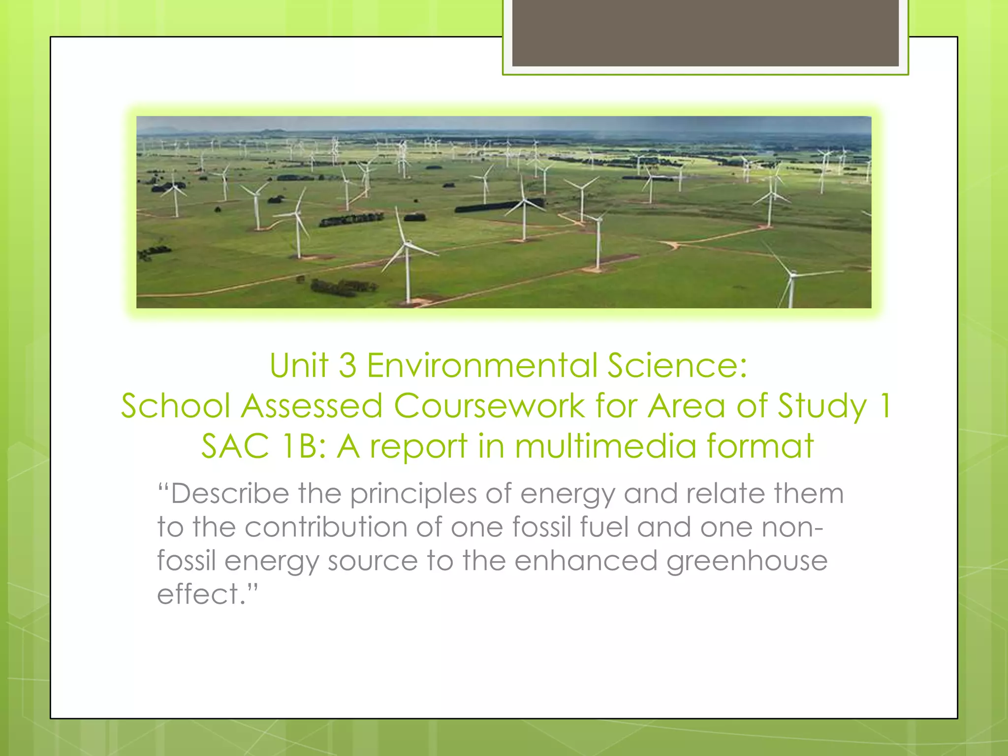 The document compares the environmental, economic, and social impacts of the Mortlake gas-fired power plant (fossil fuel) and the Macarthur wind farm (non-fossil energy source) in Australia. It discusses the principles of energy production, extraction methods, and the contribution of these energy sources to the enhanced greenhouse effect. The gas plant emits greenhouse gases due to combustion, while the wind farm has minimal emissions but can impact local wildlife.