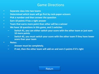 The document provides directions for a gases trivia game that can be played by separating students into two teams. The game includes 18 multiple choice questions about gas properties and behaviors. It also includes two switch cards that allow teams to swap or earn additional points. The document credits the original designers and specifies that the game can be freely adapted by non-profit schools with attribution.