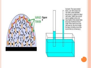The document discusses the properties and behavior of gases, liquids, and solids from a microscopic perspective. It explains that gases have particles with empty space between them allowing the particles to move freely, while liquids have particles close together allowing them to flow but slide past one another, and solids have particles locked in a fixed structure. The document also covers gas laws, phase changes, types of solids based on bonding, and heating curves. It provides a concise overview of the states of matter and changes between states from a molecular level.