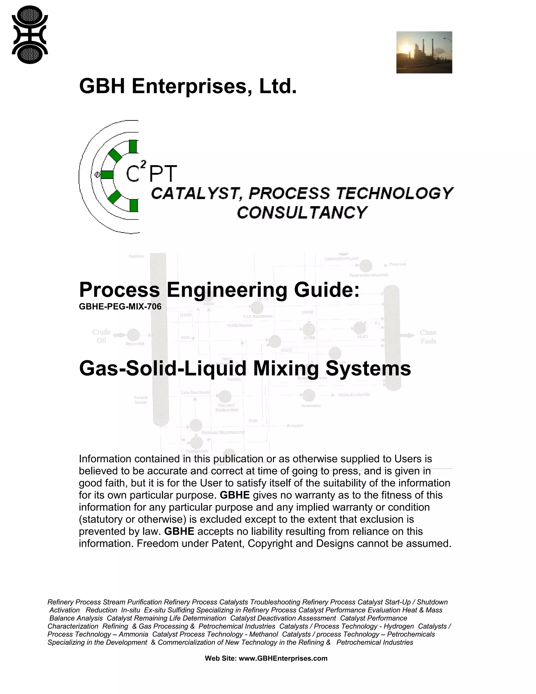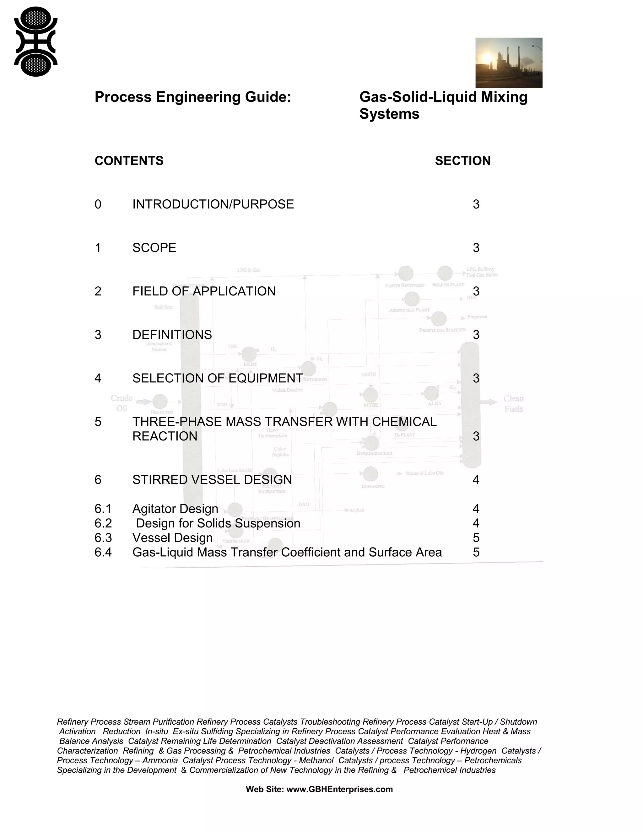 The document is a process engineering guide focused on gas-solid-liquid mixing systems, detailing equipment selection, vessel design, and mass transfer processes relevant to refinery and petrochemical industries. It emphasizes the importance of proper agitator design and operational parameters to ensure effective mixing and solid suspension under three-phase conditions. Additionally, it includes theoretical and experimental insights into three-phase systems, such as fluidized beds and slurry reactors.