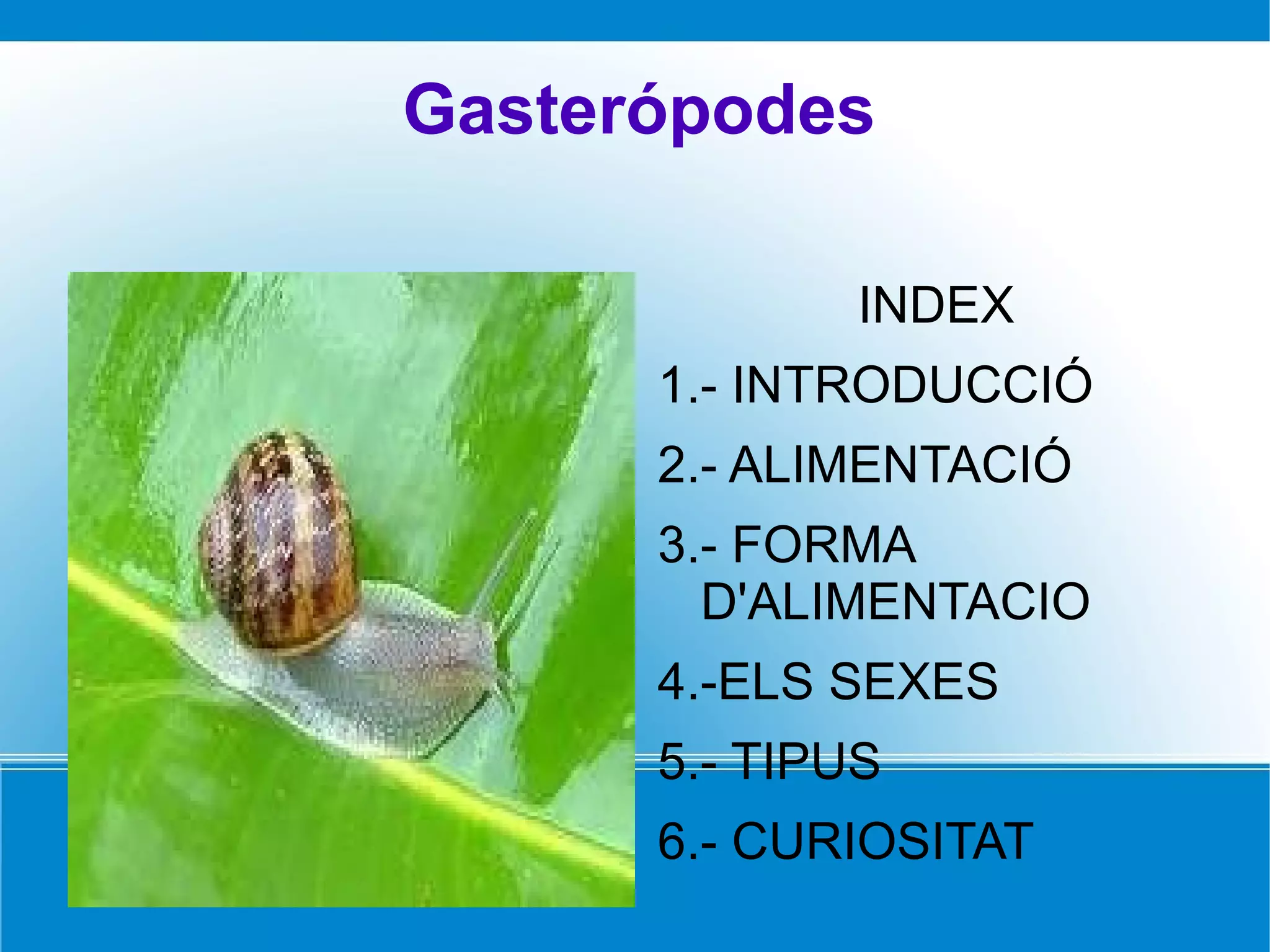 Gasterópodes INDEX 1.-INTRODUCCIÓ 2.- ALIMENTACIÓ 3.- FORMA D'ALIMENTACIO 4.-ELS SEXES 5.- TIPUS 6.- CURIOSITAT