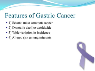 Gastric cancer is the second most common cancer worldwide. It is most common in elderly men over 65 years old. Risk factors include family history, diet high in salt/fat/nitrates, H. pylori infection, and atrophic gastritis. Premalignant conditions include polyps, intestinal metaplasia, and dysplasia. Symptoms include dyspepsia and pain induced by meat that does not respond to treatment. Staging systems include Bormann's classification and the Japanese classification. Histologically, Lauren's classification divides gastric cancer into intestinal and diffuse types based on cell morphology and growth pattern.