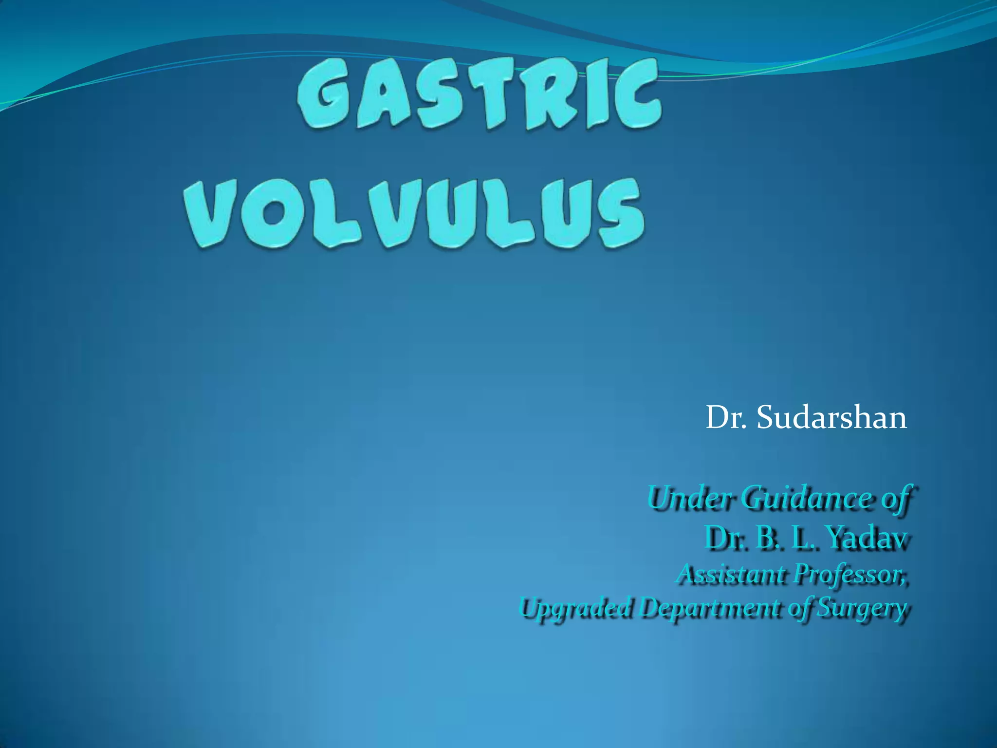 Bhori Singh, a 45-year-old male, presented with abdominal pain, distension and inability to pass flatus or stool for the past few days. Examination and investigations revealed acute intestinal obstruction likely due to gastric volvulus or perforation peritonitis. He underwent an exploratory laparotomy with gastropexy where gastric volvulus was found and repaired by suturing the stomach to the abdominal wall. Post-operatively, he recovered well and was discharged on the 8th day. Gastric volvulus is the twisting of the stomach and can be acute or chronic. Treatment involves endoscopic or surgical reduction and fixation of the stomach to prevent recurrence.