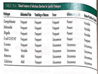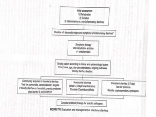 Gastrointestinal infections pose significant health risks, primarily dehydration, particularly affecting children under 5 and the elderly. Rehydration through oral rehydration therapy is essential for treatment, and infectious diarrhea can be caused by various pathogens, including viruses, bacteria, and parasites. Diagnosis and treatment strategies vary based on the type and severity of diarrhea and the causative organism, with a focus on fluid replacement and targeted antimicrobial therapy as needed.