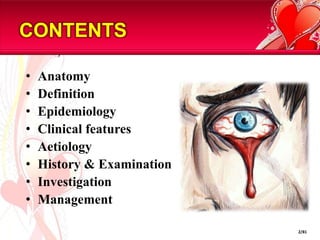 This document provides information on gastrointestinal bleeding, including its anatomy, definition, epidemiology, clinical features, etiology, history and examination, investigation, and management. It discusses the major sites of upper and lower GI bleeding. For upper GI bleeding it covers topics such as esophageal varices, Mallory-Weiss tears, esophageal cancer, peptic ulcer disease, erosive gastritis, gastric cancer, and Dieulafoy's disease. For lower GI bleeding it briefly mentions duodenitis. It provides details on the pathogenesis, clinical presentation, investigations and treatment of many of these conditions.