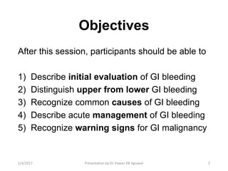 1) The document discusses the evaluation and management of gastrointestinal (GI) bleeding. It describes differentiating upper from lower GI bleeding, recognizing common causes, and acute management steps.