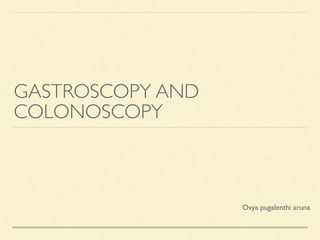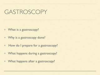 This document provides information about gastroscopy and colonoscopy procedures. It describes what each procedure involves, how to prepare, what happens during, and reasons for having them. A gastroscopy examines the esophagus, stomach and duodenum using an endoscope to investigate symptoms like heartburn or bleeding, and can treat issues like polyps. Preparation involves not eating for 6 hours prior. A colonoscopy examines the entire large bowel using a colonoscope to search for cancer, polyps or other abnormalities. Common reasons are investigating symptoms or screening. Preparation requires dietary changes and laxative solution intake. Both procedures involve being sedated while the scope is inserted and gentle examination of the organs.