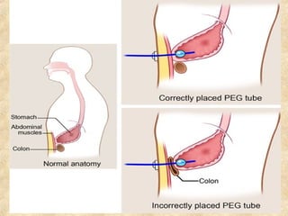 Gastrostomy is a surgical opening made in the stomach to allow for placement of a feeding tube. It is indicated for patients who require prolonged tube feeding for over 4 weeks due to conditions such as neurological swallowing disorders, esophageal cancer, or gastric outlet obstruction. There are two main types - open gastrostomy involving surgical incision and percutaneous endoscopic gastrostomy (PEG) which is performed endoscopically. Complications can include infection, hemorrhage, leakage or displacement of the tube. Gastrostomy allows for safe enteral feeding in patients with poor oral intake who have a functional gastrointestinal system.