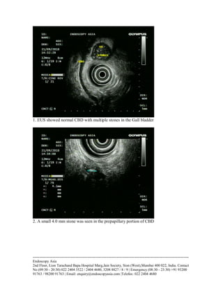 A 46-year-old male with mildly abnormal LFT and gallstones on USG was referred for suspected CBD obstruction. EUS revealed a normal CBD with a 4 mm stone in the prepapillary portion. ERCP was then performed and selective cannulation of CBD showed a normal sized CBD. A biliary sphincterotomy was performed and the 4 mm stone seen on EUS was extracted with a dormia basket, clearing the CBD.