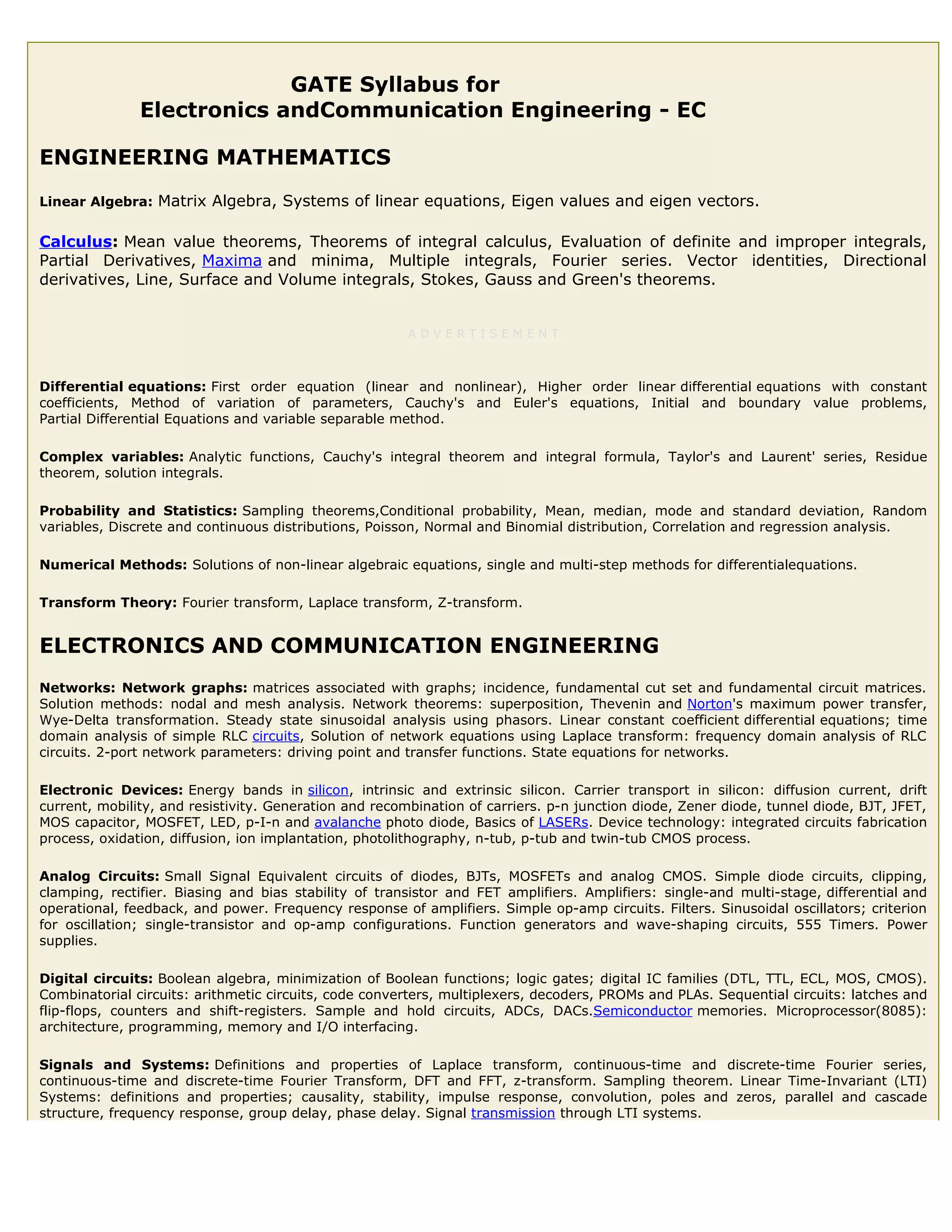 The document provides a syllabus for the GATE exam for Electronics and Communication Engineering. It outlines the topics that will be covered in the following areas: