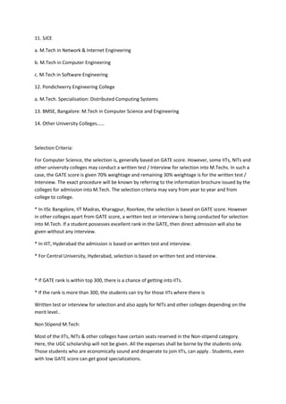 The document provides guidelines and recommendations for admissions to M.Tech/M.E programs in Computer Science and IT branches at top Indian universities. It lists the preferred order of specializations and institutes. IISc Bangalore is recommended as the top choice, followed by various IITs, IIITs, NITs and other engineering colleges. The selection criteria including GATE score cut-offs and the weightage given to interviews is detailed for different universities. Special notes are provided for SC/ST students, girls and those with second class degrees to improve their chances of admission.