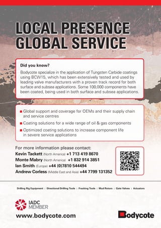 Bodycote is a leading supplier of coatings for gates and seats used in subsea assemblies and land-based drilling rigs. They apply tungsten carbide coatings to valve components to provide wear and corrosion resistance, allowing the components to withstand pressures over 20,000 psi. Bodycote has specialized coatings for the oil and gas industry and can provide global support for component manufacturing.