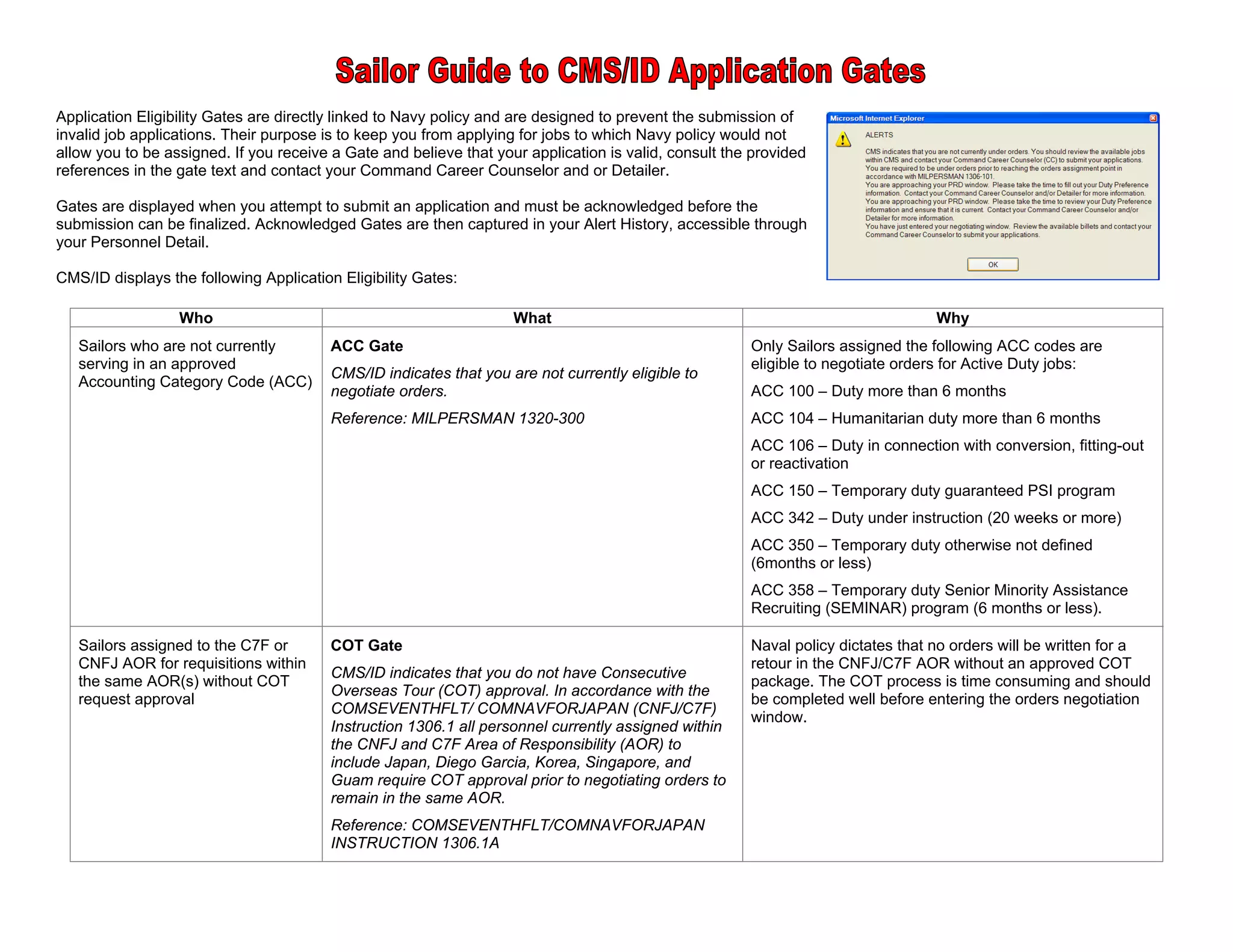 Application Eligibility Gates displayed by CMS/ID are directly linked to Navy policy and are designed to prevent invalid job applications. Gates keep Sailors from applying to jobs that Navy policy would not allow, and must be acknowledged before submitting an application. Gates are captured in the Sailor's Alert History for future reference. Common gates include those for Sailors outside their authorized paygrade range, rate, or who require additional approvals like COT, PTS, or EFM. Sailors should consult references in the gate text or their Career Counselor if they believe their application is still valid.