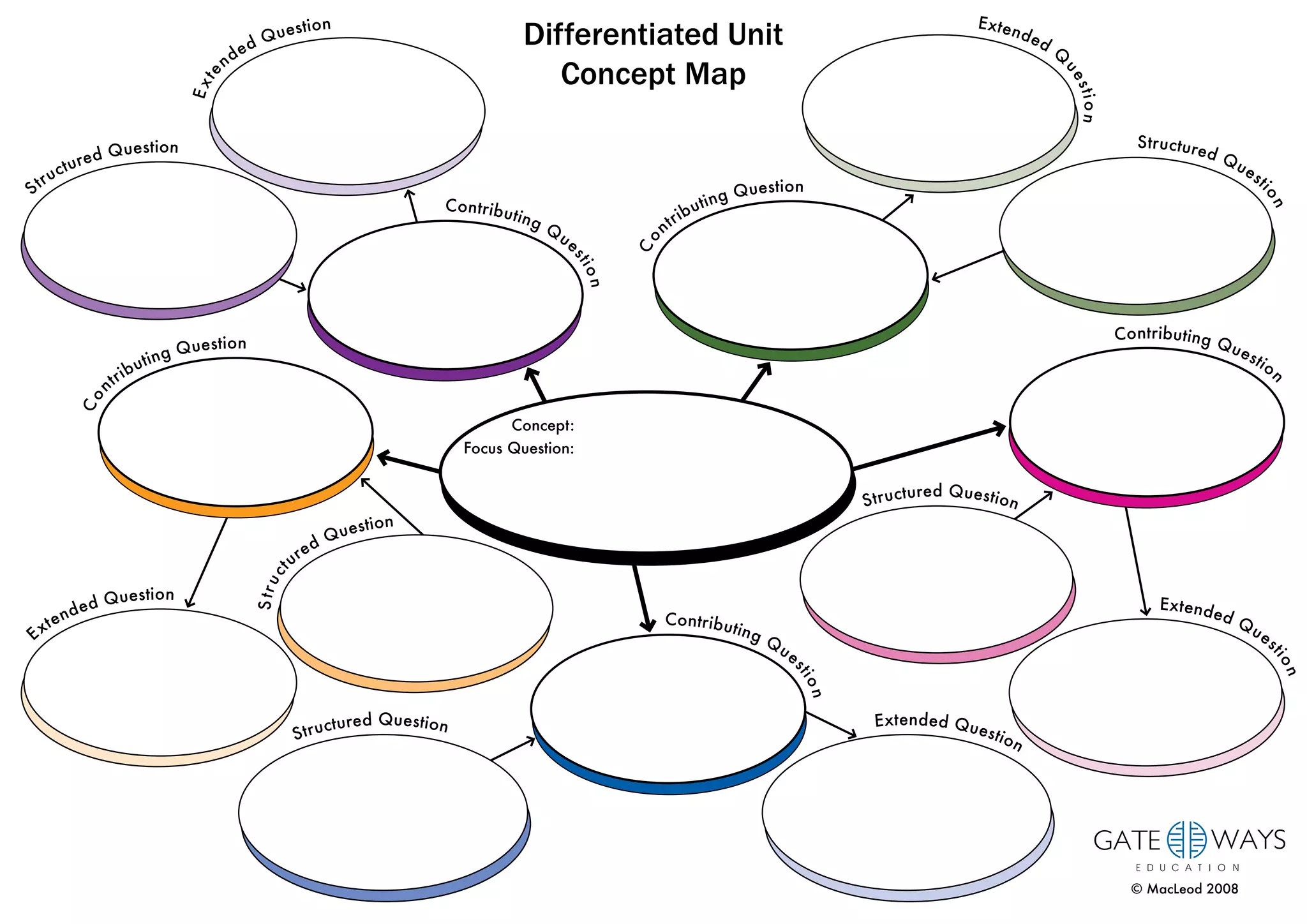 This concept map outlines a differentiated unit plan with an overarching focus question and various question types such as contributing questions, extended questions, and structured questions to explore the concept.
