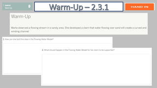 This document discusses using models to gather evidence about geological formations on Mars. It describes a student observing a model of flowing lava to determine if lava could have formed channels on Mars that are similar in shape to an observed channel. The model shows lava forming a channel with a triangular cross-section at the bottom, matching the shape of the channel on Mars, providing evidence that lava may have created it. The document suggests students will learn more evidence from NASA about the geological processes that formed the channel to help determine if it resulted from lava or water.