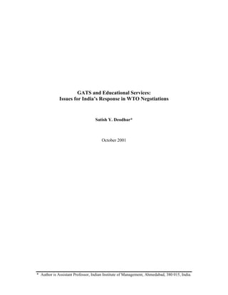 This document discusses India's response to negotiations on trade in educational services under the General Agreement on Trade in Services (GATS) within the World Trade Organization (WTO). It outlines that trade in educational services is an important issue for India that requires thorough analysis before commitments are made. The document analyzes how GATS applies to the educational sector and discusses India's competitiveness in educational services trade and options for negotiations and domestic reforms.