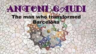 Antoni Gaudi was a Spanish architect born in 1852 who is renowned for transforming Barcelona through his unique modernist designs. After studying architecture, he began small projects but found patronage from Eusebi Guell. Gaudi then designed buildings and parks for Guell, including Park Guell featuring bright tile mosaics and curving lines inspired by nature. However, Gaudi is best known for the massive but still unfinished Sagrada Familia church in Barcelona, which he worked on from 1882 until his death in 1926 when he was hit by a tram.