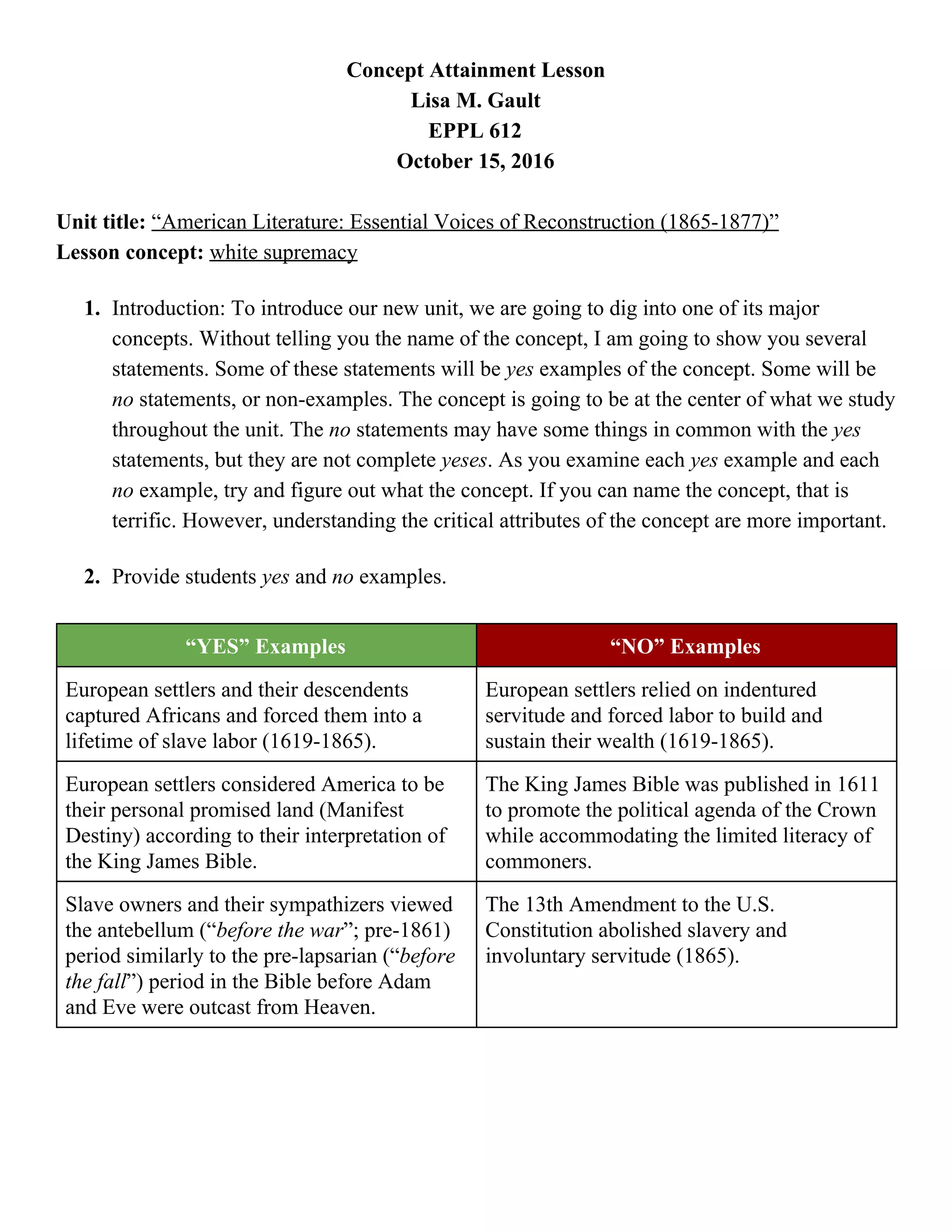 1) The document describes a concept attainment lesson about the concept of white supremacy during the post-Civil War Reconstruction era in America (1865-1877).
