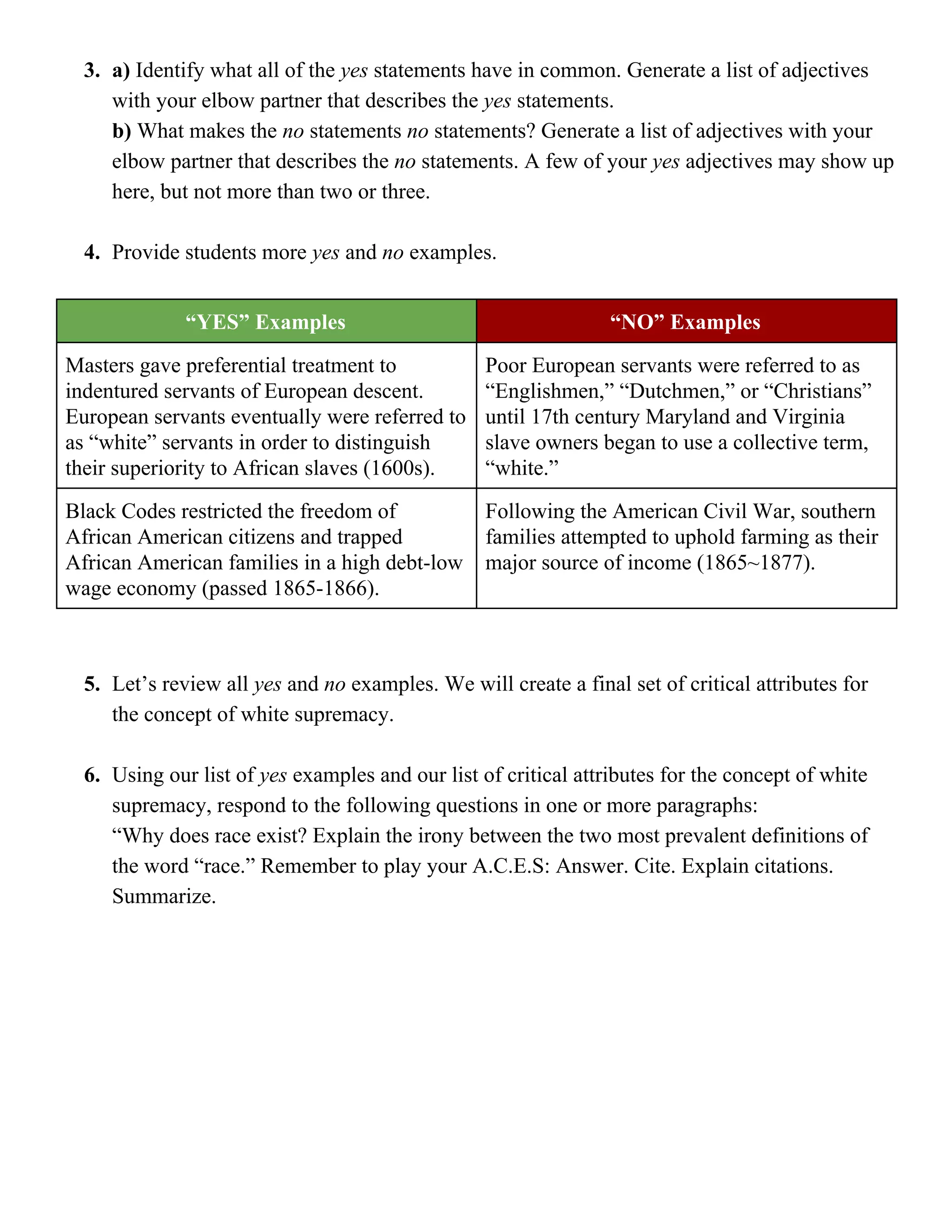 3) After more examples are provided, students create a final list of critical attributes to define the concept of white supremacy, which is then used to answer questions about why race exists and the irony in definitions of the word "race."