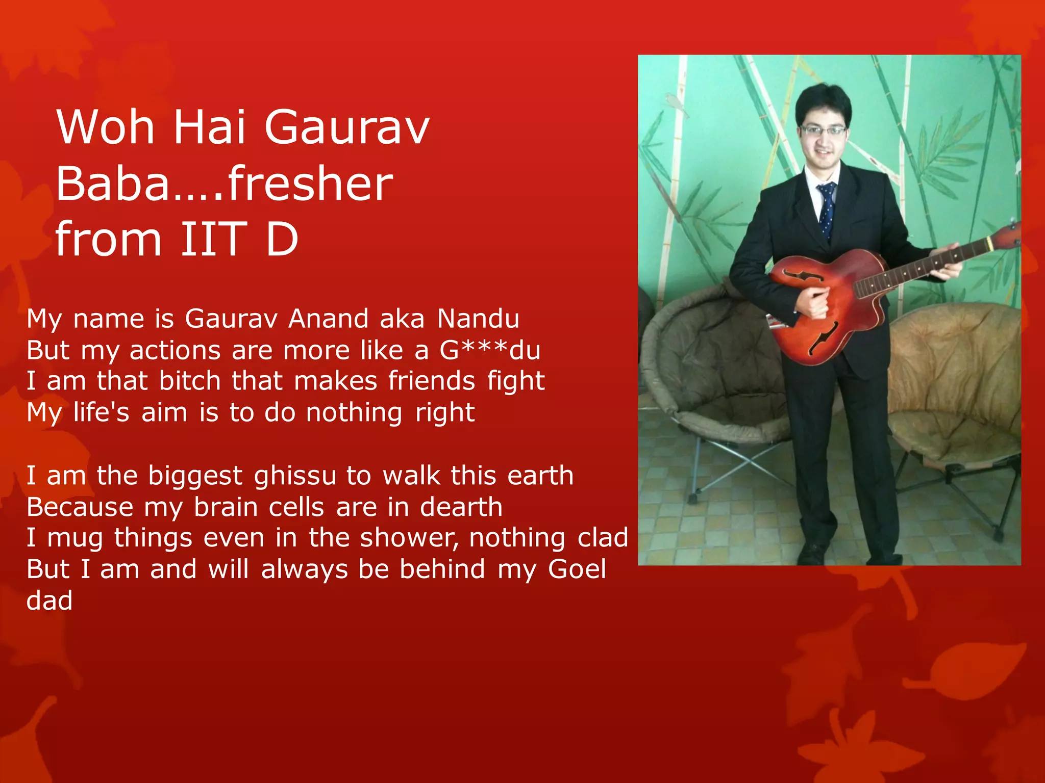 Gaurav introduces himself as a fresher from IIT Delhi. He describes himself as someone who causes fights between friends and aims to do nothing right. He brags about getting good grades but also admits to always being behind others. He is described as a class sleeper who mentors many on resumes and claims to be gorgeous. Though he says he is a teetotaller, he acts like Devdas when alcohol is around. He has a history of awkward encounters and failed attempts at relationships.