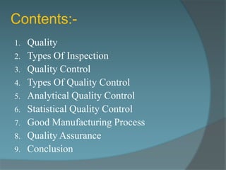 This document discusses various aspects of quality control including: