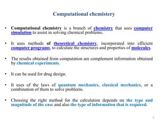 Gaussian is a computational chemistry software package used to calculate the structures and properties of molecules. It uses quantum mechanics and density functional theory to solve chemical problems without experiments. Gaussian can optimize molecular geometries, calculate vibrational frequencies, and determine properties like infrared spectra. It provides information on molecular energies, structures, reaction pathways and more through simulation.