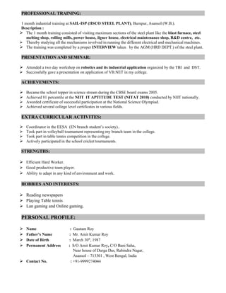 Gautam Roy is seeking a position where he can utilize his technical skills and experience. He has a B.Tech from Krishna Institute of Engineering & Technology with expertise in VB.NET, C++, and SQL. His projects include developing a student database management form using VB.NET and MS Access. He has work experience in industrial training at SAIL-ISP and additional skills in presentation, seminar participation, and extracurricular activities.