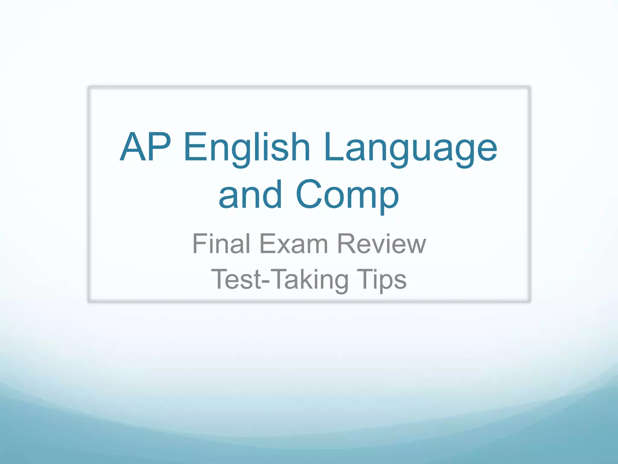The document provides a review and tips for an upcoming AP English Language and Composition final exam. It states that the exam will be open from May 10-11, include 50 multiple-choice questions over 90 minutes, and cover content from course quizzes, module reviews, and two reading passages. It offers advice on preparing for quiz-based, module review, and passage-based questions, including examples of each type. It provides sample exam questions to help students practice.