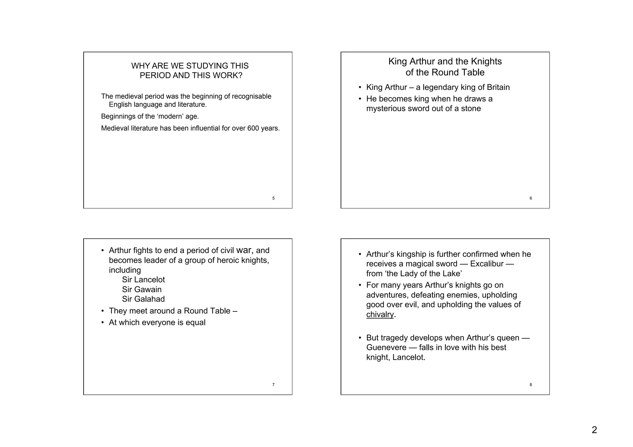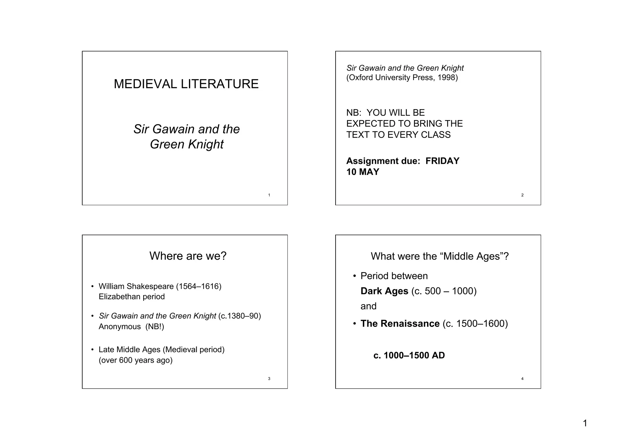 The document provides context and summary for the medieval poem Sir Gawain and the Green Knight. It introduces the poem's setting in King Arthur's court during Christmas celebrations. It describes how a mysterious green knight arrives and challenges one of the knights to a beheading game. Sir Gawain accepts the challenge and must seek out the Green Knight to receive his blow the following year. The document analyzes themes of courtesy, chivalry and keeping one's word through promises in the poem.