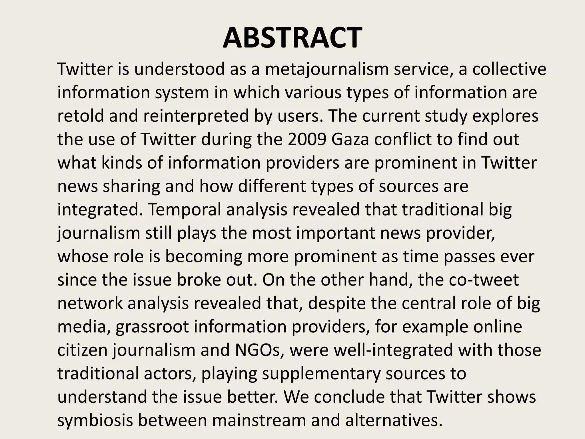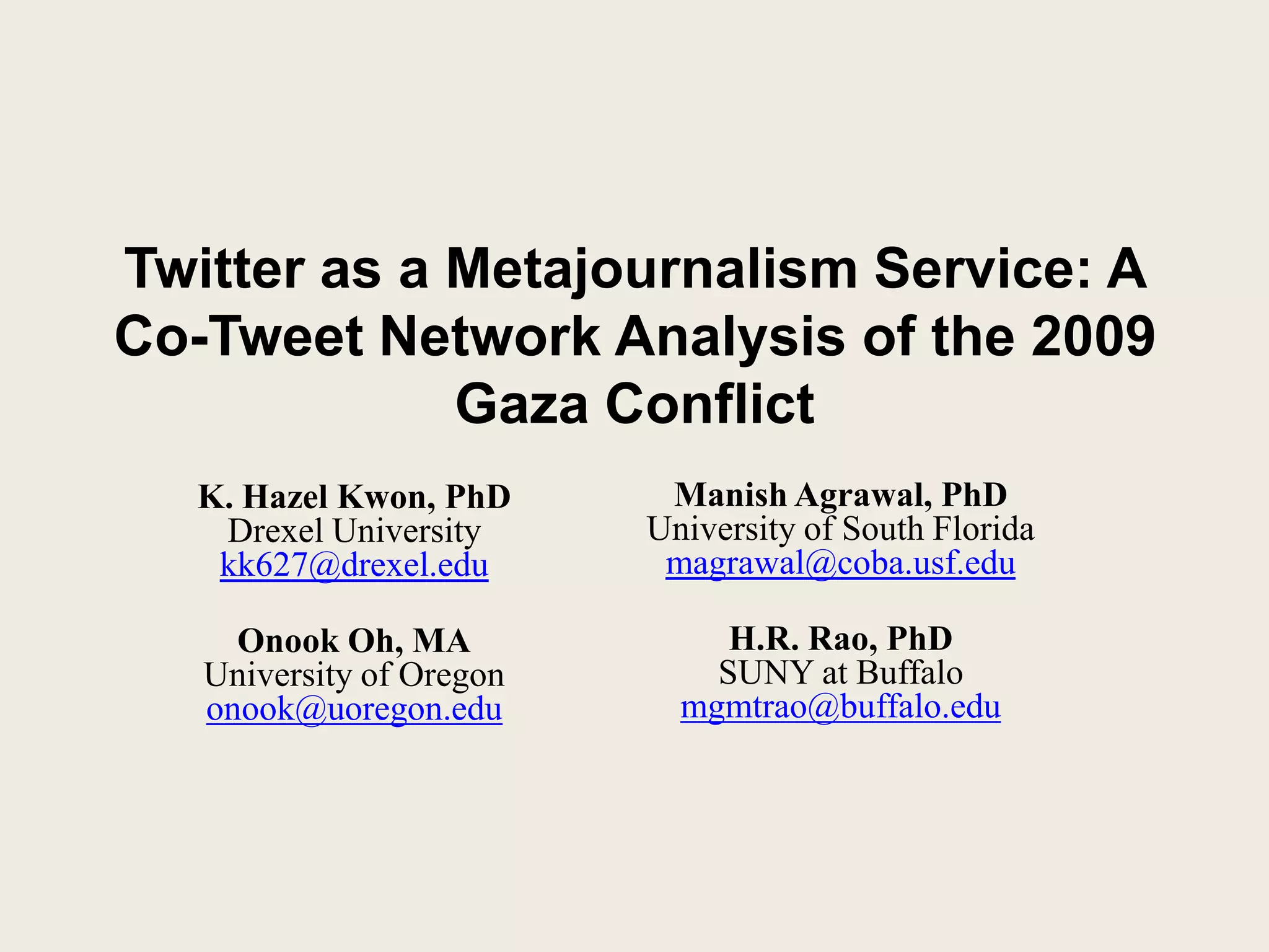 (1) This study analyzed how information about the 2009 Gaza conflict was shared on Twitter. It found that traditional large media organizations like the BBC and New York Times were most prominent initially but their role increased over time.