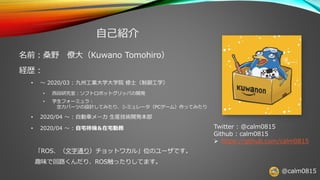 ~ 2020/03 : 九州工業大学大学院 修士(制御工学) • 西田研究室:ソフトロボットグリッパの開発 • 学生フォーミュラ: 空力パーツの設計してみたり、シミュレータ(PCゲーム)作ってみたり • 2020/04 ~ : 自動車メーカ 生産技術開発本部 • 2020/04 ~ : 自宅待機&在宅勤務 Twitter : @calm0815 Github : calm0815 ➢ https://github.com/calm0815 「ROS、(文字通り)チョットワカル」位のユーザです。 趣味で回路くんだり、ROS触ったりしてます。