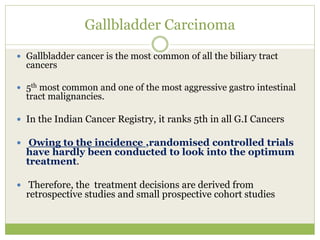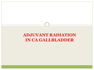 The document discusses adjuvant radiation therapy for gallbladder carcinoma based on available literature. It summarizes several retrospective studies that found improved survival outcomes with adjuvant radiation or chemoradiation after surgical resection compared to surgery alone, especially for node-positive or advanced-stage disease. However, it notes the evidence is limited due to the rarity of the disease and lack of large randomized controlled trials. While adjuvant therapy appears logical, more research is still needed to better define its role and optimal use.