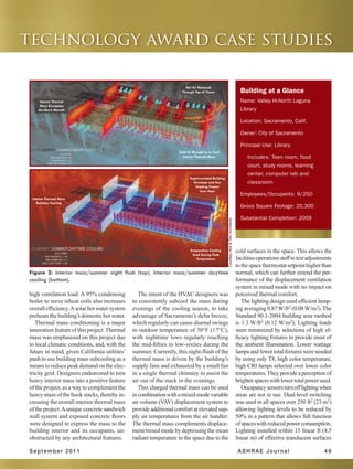The Valley Hi-North Laguna library in Sacramento, California uses several passive and efficient design strategies to achieve a 36.9% reduction in energy use compared to code and LEED Gold certification. These strategies include daylight harvesting through a sloped roof and north-facing windows, rainwater collection, displacement ventilation, thermal mass to pre-cool interior surfaces at night, and efficient lighting. Monitoring has found that actual electricity use matches predictions, though natural gas use exceeds simulations, which designers continue to investigate.