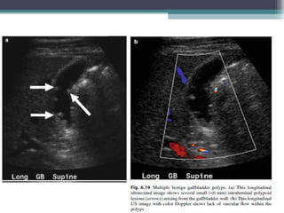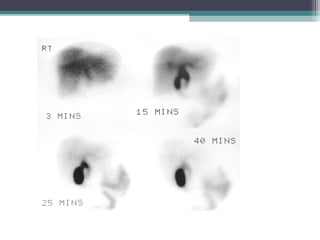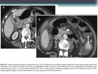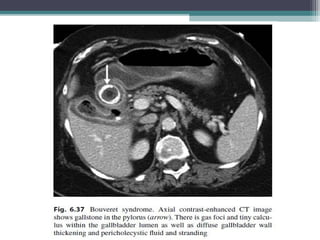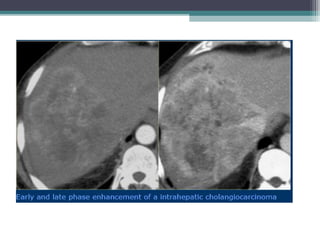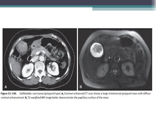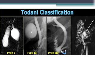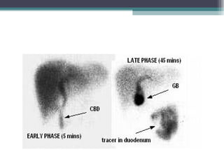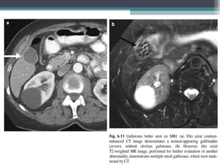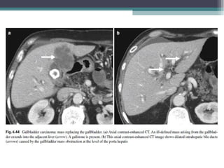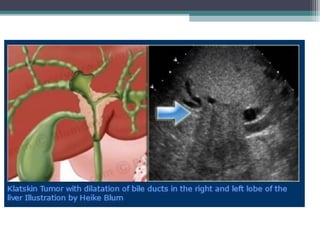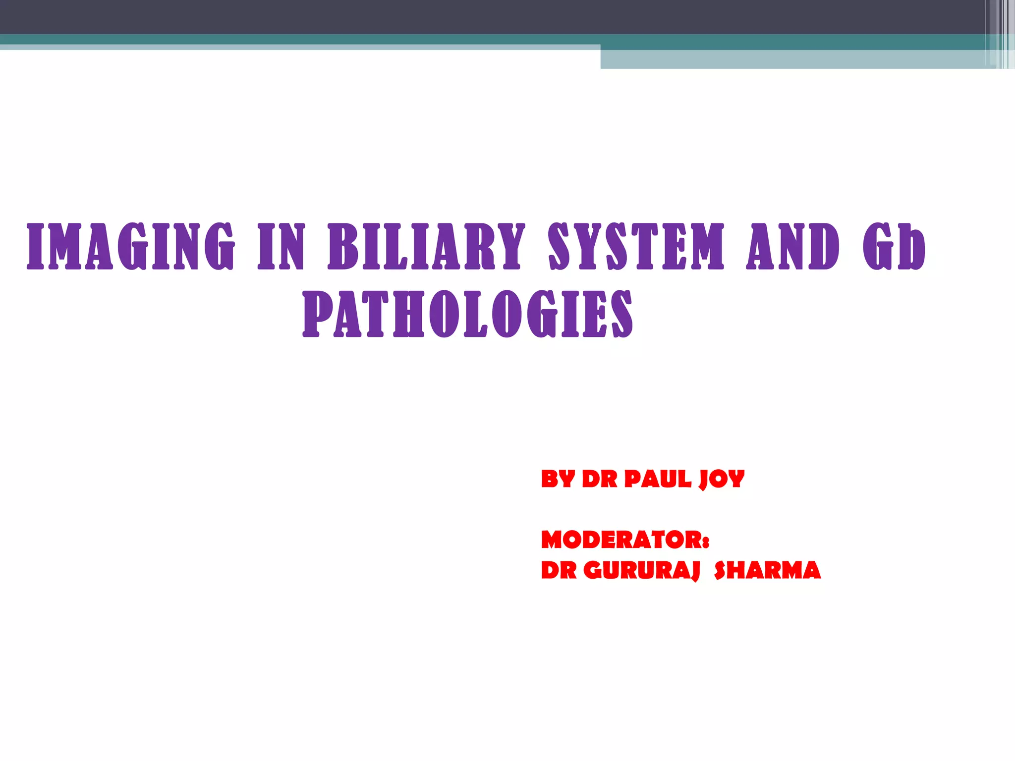 This document discusses imaging modalities for evaluating obstructive jaundice and biliary pathologies. It describes the role of various imaging modalities like ultrasound, CT, MRI/MRCP, and ERCP in identifying the level and cause of biliary obstruction. Common causes of obstruction include gallstones, strictures, pancreatitis, and malignancies. Rare causes like choledochal cysts, Caroli's disease, and biliary atresia are also reviewed. The document provides an overview of the appearance of different biliary diseases on imaging and guidelines for selecting the appropriate imaging test.