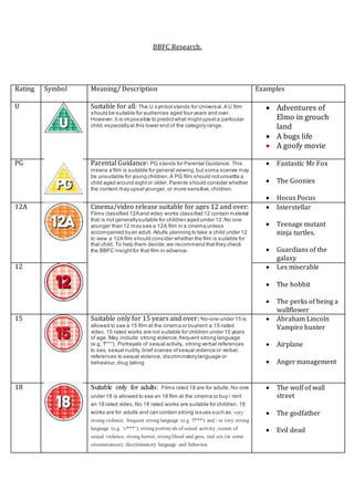 This document provides information on the British Board of Film Classification (BBFC) rating system. It outlines the meaning and examples for each rating: U (universal), PG (parental guidance), 12A (cinema/video release for ages 12 and over), 15 (suitable for ages 15 and over), and 18 (suitable for adults only). Violence, language, sexual content, and other factors determine the rating. The passage explains that the BBFC examines films and videos before release to classify them and provide age ratings and insights to protect children and inform consumers.