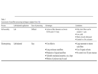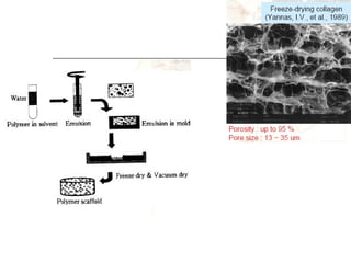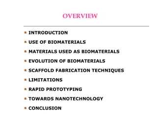This document discusses various biomaterial fabrication techniques. It begins with an introduction to biomaterials and their uses. It then describes common materials used as biomaterials and the evolution of biomaterials. Several scaffold fabrication techniques are outlined, including solvent casting, melt molding, gas foaming, freeze drying, and fiber bonding. Limitations of these techniques are noted. Rapid prototyping and nanofabrication techniques that allow for more control and precision are also summarized.