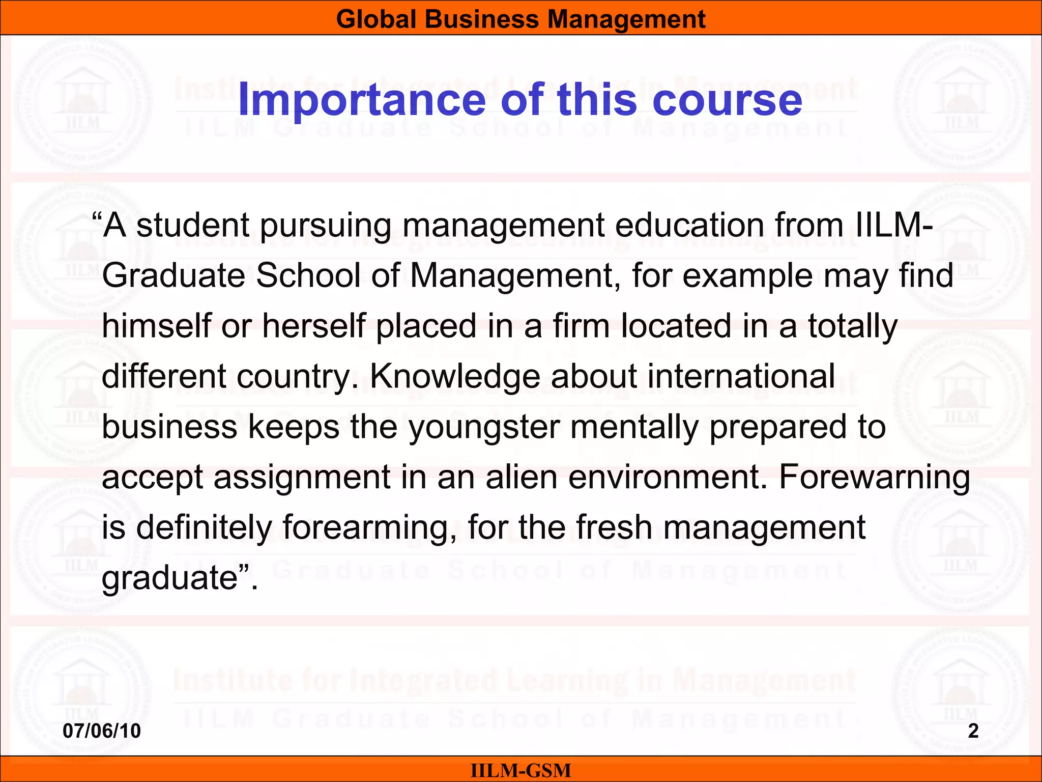 The document discusses the importance of international business knowledge for management students. It notes that graduates may find themselves working in foreign countries, so understanding international business will help prepare them mentally. The rest of the document outlines the topics and contents of a course on international business management, including globalization, global trade, economic and political environments, and foreign direct investment.