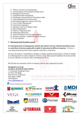 Global Business Solutions is an established HR consulting firm that offers mentorship, training, and placement services. It has a panel of experienced industry professionals who provide expertise in business solutions. The firm's services include organizational development, change management training, and executive search and placement. It has a diverse client base of large companies across various industries. The firm's training programs cover topics like leadership, vision/mission development, team building, and stress management. It also assists management students and specialized course graduates with placements.