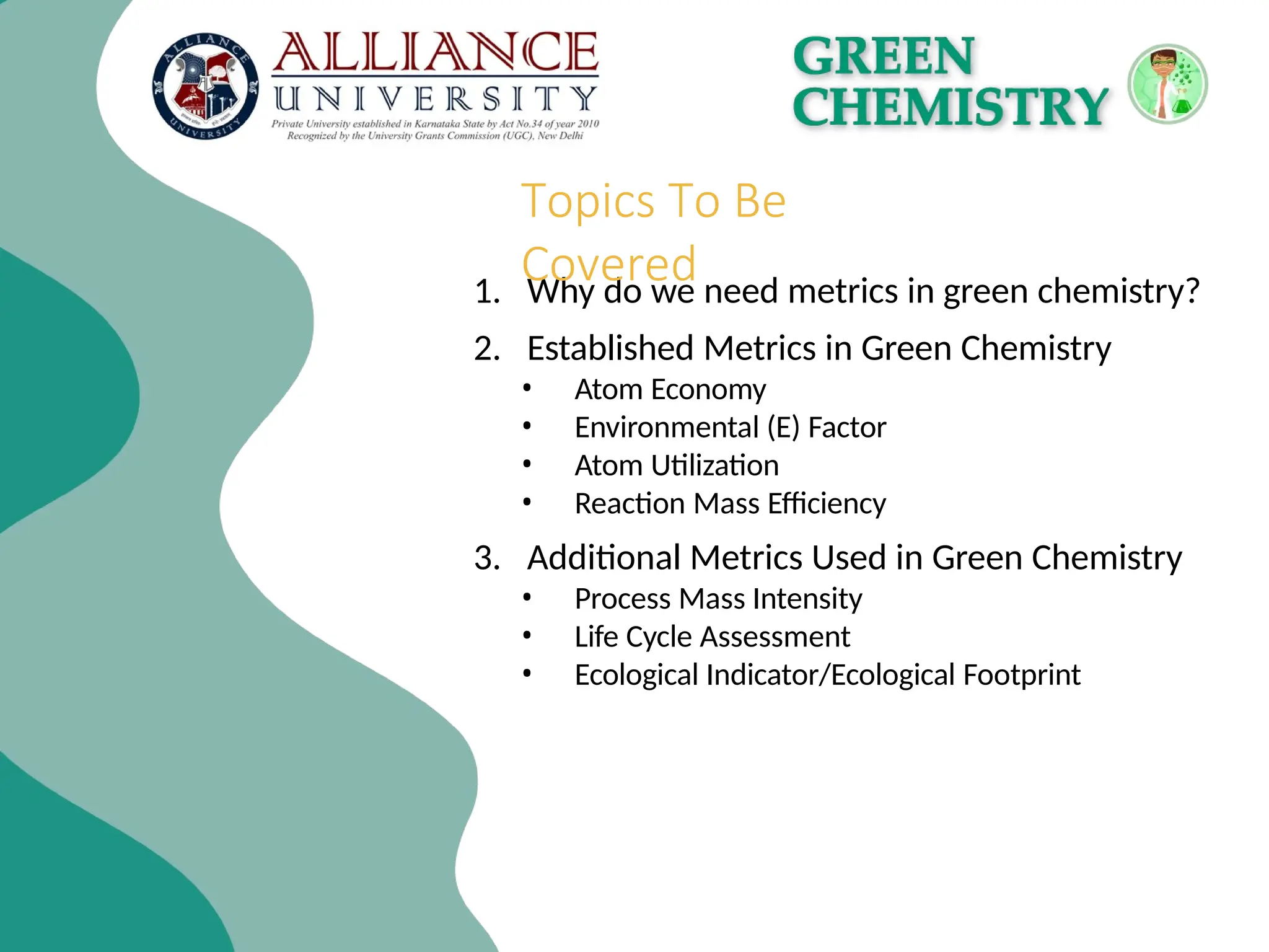 The document discusses the importance of metrics in green chemistry for evaluating chemical reaction efficiency, including established metrics like atom economy, environmental factor, atom utilization, and reaction mass efficiency. It highlights the benefits of using these metrics through examples such as the greener synthesis of ibuprofen, which demonstrates improved atom utilization and reduced waste compared to traditional methods. Additionally, it covers various additional metrics relevant to assessing the environmental impact of chemical processes.