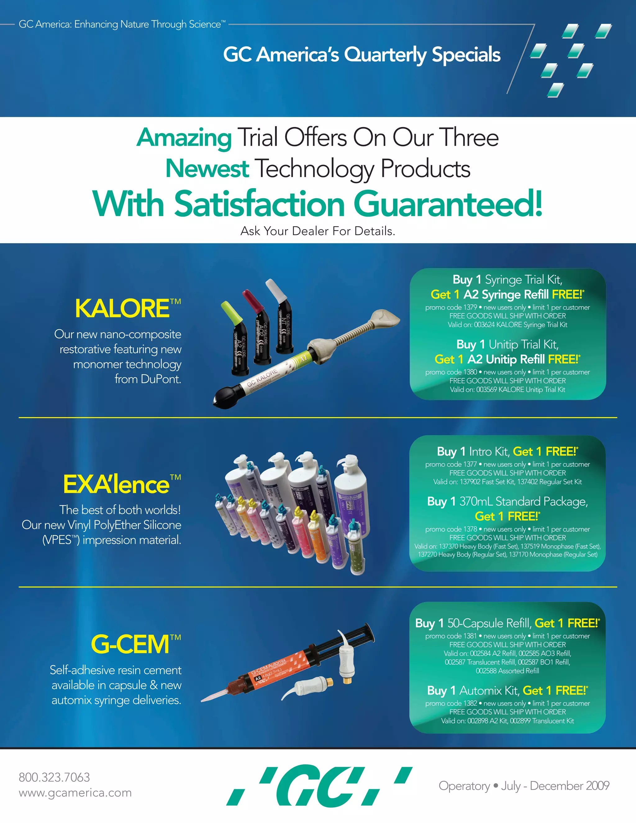 GC America is offering trial offers on three new technology products - KALORE, EXA'lence, and G-CEM - with satisfaction guaranteed. Customers can buy one trial kit or package and get a second of equal or lesser value for free by using a listed promo code. The offers are for new users only and have a one per customer limit. The free goods will ship with the initial order. Expiration dates range from July to December 2009.