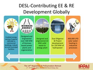G.C. Datta Roy gave a presentation on waste heat utilization at the 14th Regulators & Policymakers Retreat in Goa, India. The presentation discussed the large untapped potential of waste heat as an energy source globally and in countries like the US, China, and Japan. It provided case studies of DESL projects in India utilizing waste heat from industries like sponge iron plants, forging furnaces, and boilers. It noted that while waste heat recovery penetration is high for some applications, it remains very low overall in India. Barriers to waste heat utilization included low awareness, technology risks, and a lack of policy support. The presentation proposed the development of Waste Heat Recovery Alliances to help promote